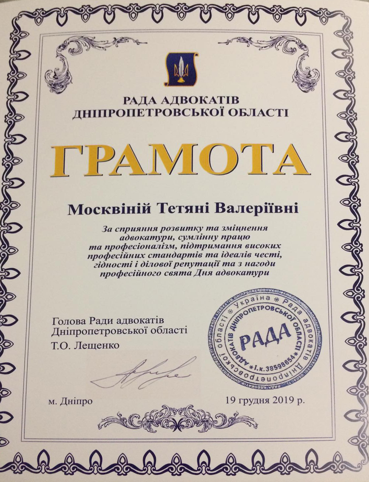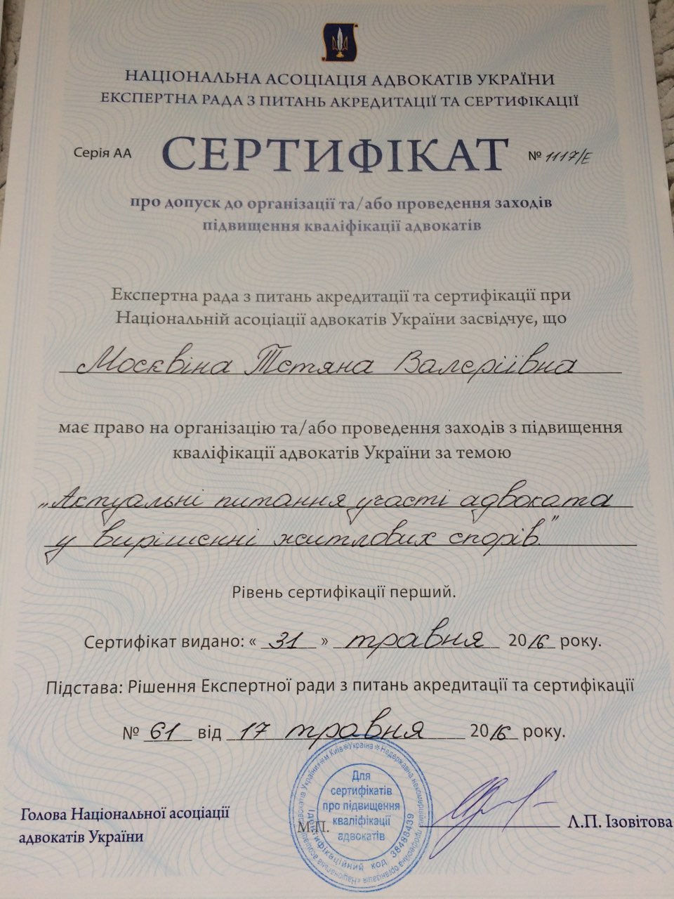 Свидетельство о праве на занятие адвокатской деятельностью №1475 от 20.12.2005 г.